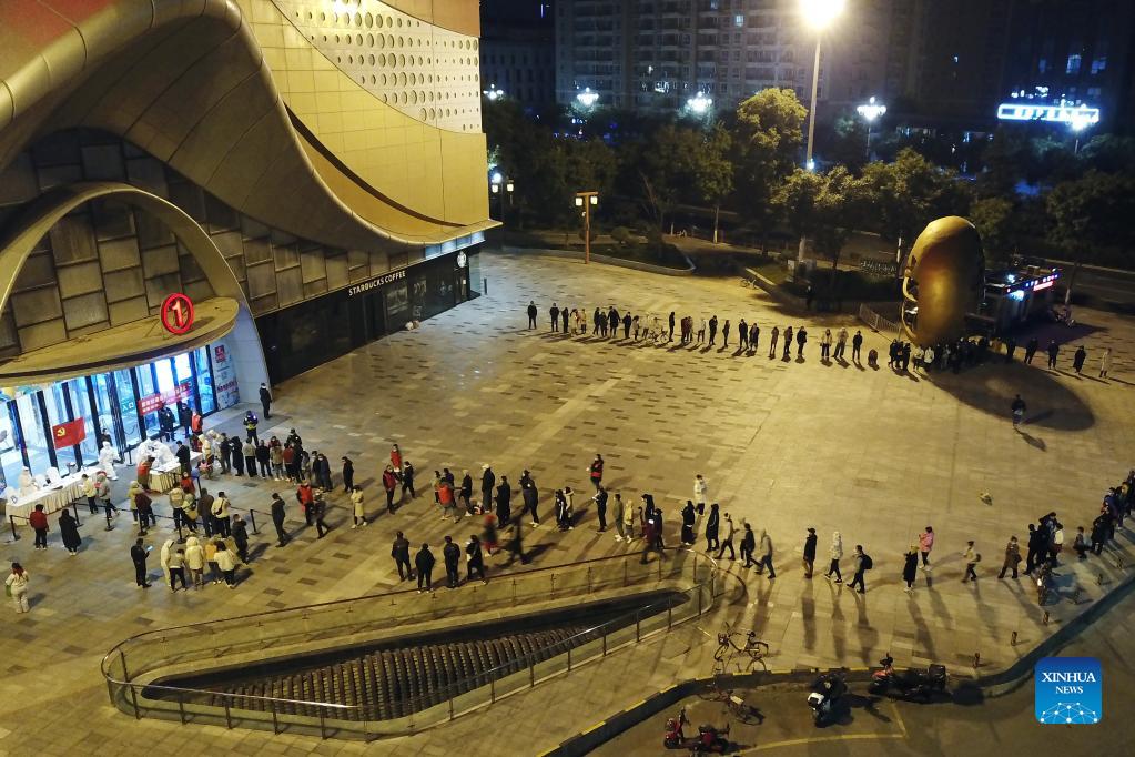 Aerial photo taken on Oct. 21, 2021 shows citizens queuing up at midnight at a nucleic acid testing site in Chengguan District of Lanzhou City, northwest China's Gansu Province. As of 8 p.m. Wednesday, Lanzhou has registered a total of eight locally transmitted confirmed COVID-19 cases and one asymptomatic case since new local infections were reported. Local authorities set up hundreds of nucleic acid testing sites to provide 24-hour testing services for the residents. (Xinhua/Fan Peishen)