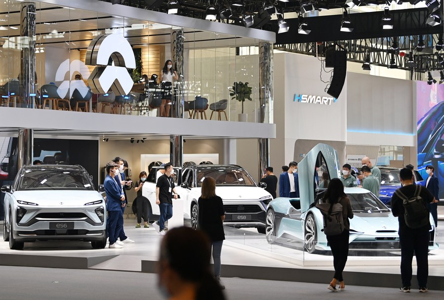 Visitors view electric cars during China (Tianjin) Auto Show 2021 in north China's Tianjin, Sept. 29, 2021. (Xinhua/Li Ran)