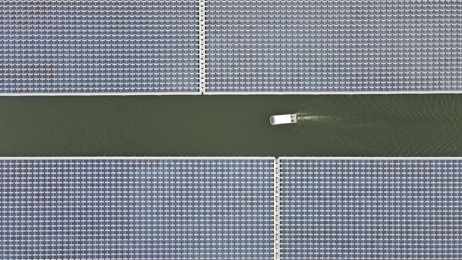 Aerial photo taken on July 20, 2021 shows a floating solar farm in Panji District of Huainan City, east China's Anhui Province.(Xinhua/Huang Bohan)