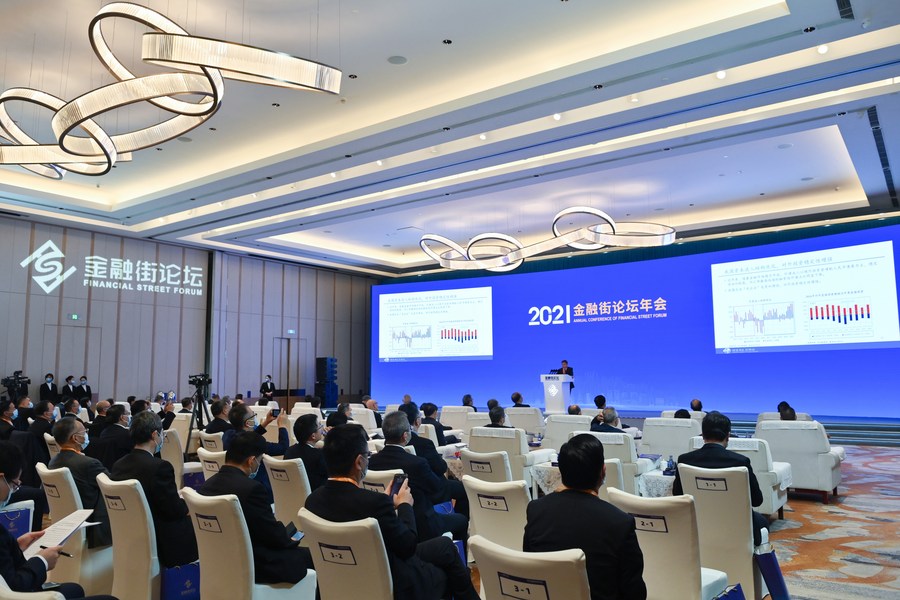 Delegates attend the opening ceremony and plenary session of the 2021 Annual Conference of Financial Street Forum in Beijing, capital of China, Oct. 20, 2021. (Xinhua/Ju Huanzong)