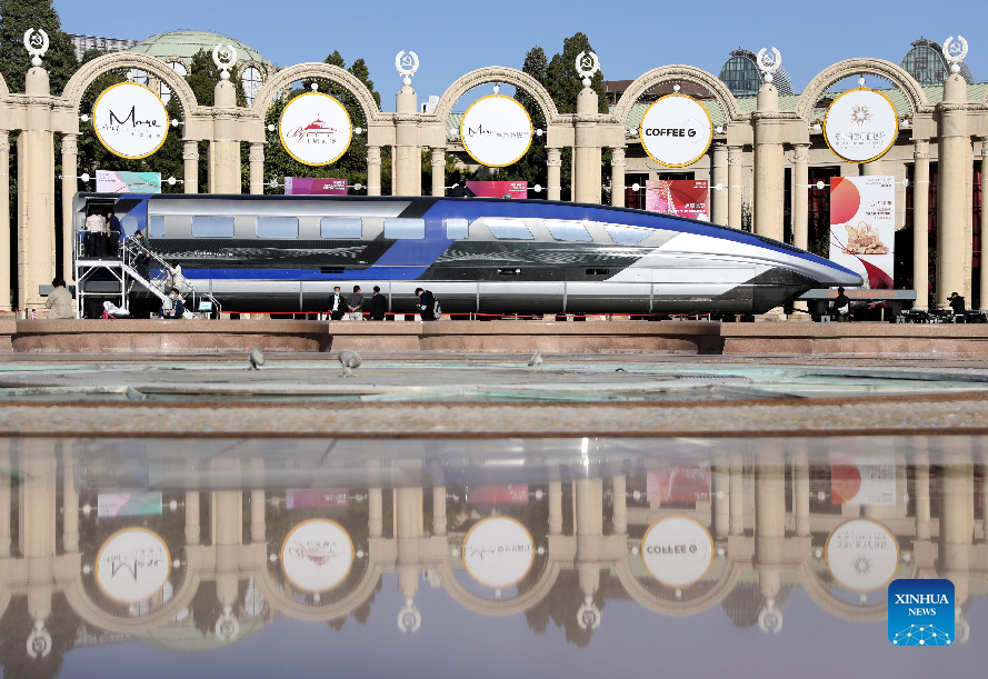 Visitors view a 600 kph high-speed maglev train at an exhibition on China's major scientific accomplishments during the 13th Five-Year Plan period (2016-2020) in Beijing, capital of China, Oct. 21, 2021. An exhibition showing China's achievements in scientific and technological innovation during the 13th Five-Year Plan period kicked off here on Thursday. (Xinhua/Jin Liwang)