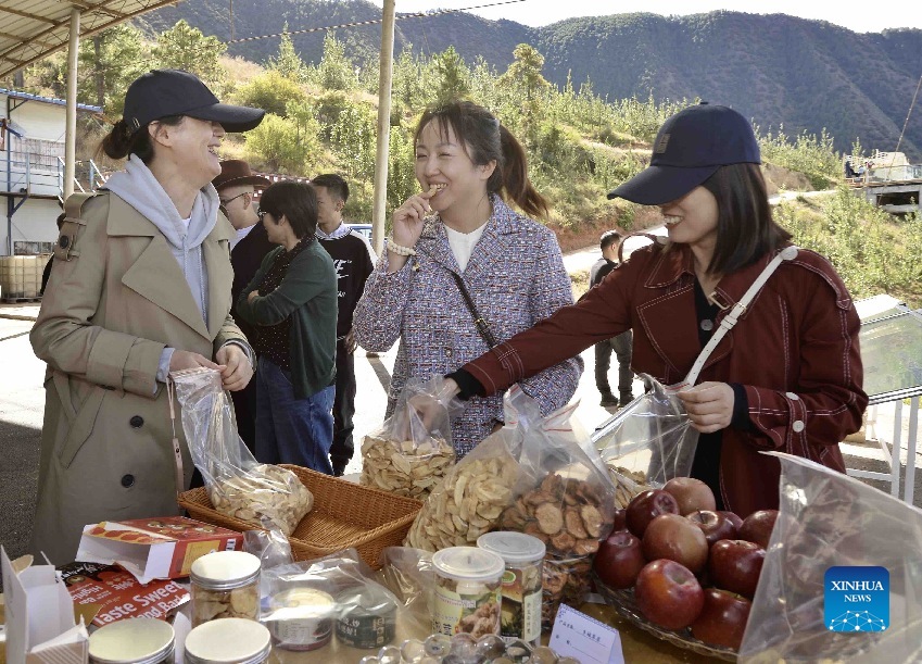 Customers taste dried apples in Qingde Town of Xiangcheng County, Ganzi Tibetan Autonomous Prefecture, southwest China's Sichuan Province, Oct. 20, 2021. A plateau town in southwest China, Qingde has been taking advantage of the local geographic and climate conditions to promote apple planting. (Xinhua/Liu Kun)