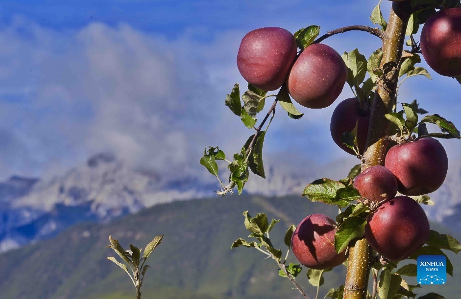 Photo taken on Oct. 20, 2021 shows apples in Qingde Town of Xiangcheng County, Ganzi Tibetan Autonomous Prefecture, southwest China's Sichuan Province. A plateau town in southwest China, Qingde has been taking advantage of the local geographic and climate conditions to promote apple planting. (Xinhua/Liu Kun)