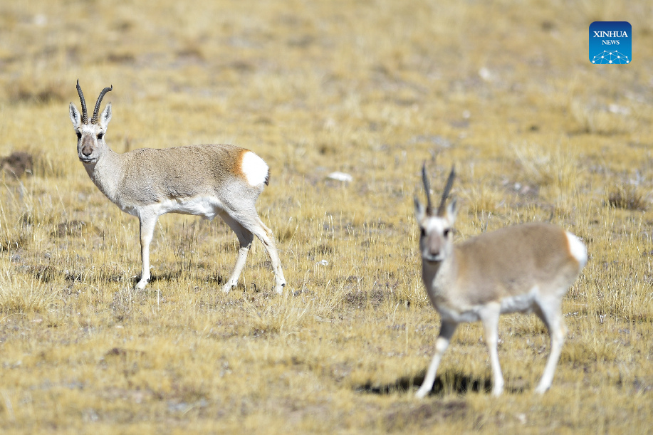 Photo taken on Oct. 19, 2021 shows Tibetan antelopes at the source of the Yellow River section of the Sanjiangyuan National Park in Golog Tibetan Autonomous Prefecture of northwest China's Qinghai Province. (Xinhua/Zhang Long)