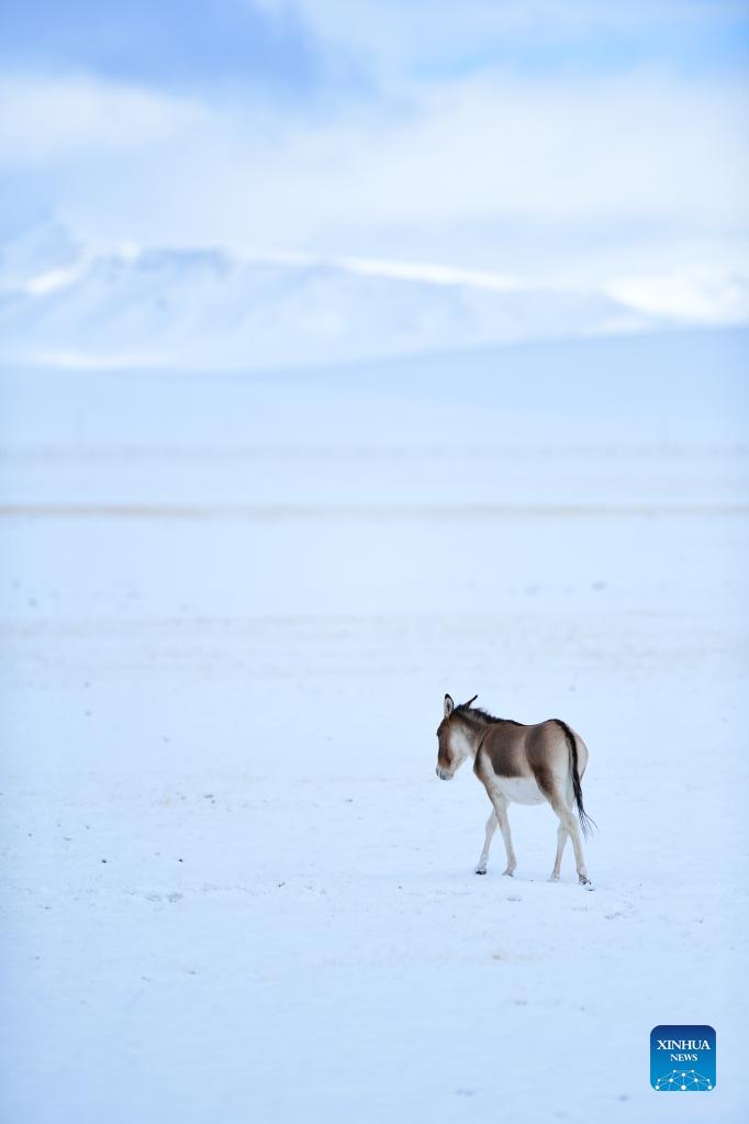 Photo taken on Oct. 20, 2021 shows a Tibetan wild donkey at the source of the Yellow River section of the Sanjiangyuan National Park in Golog Tibetan Autonomous Prefecture of northwest China's Qinghai Province. (Xinhua/Zhang Long)