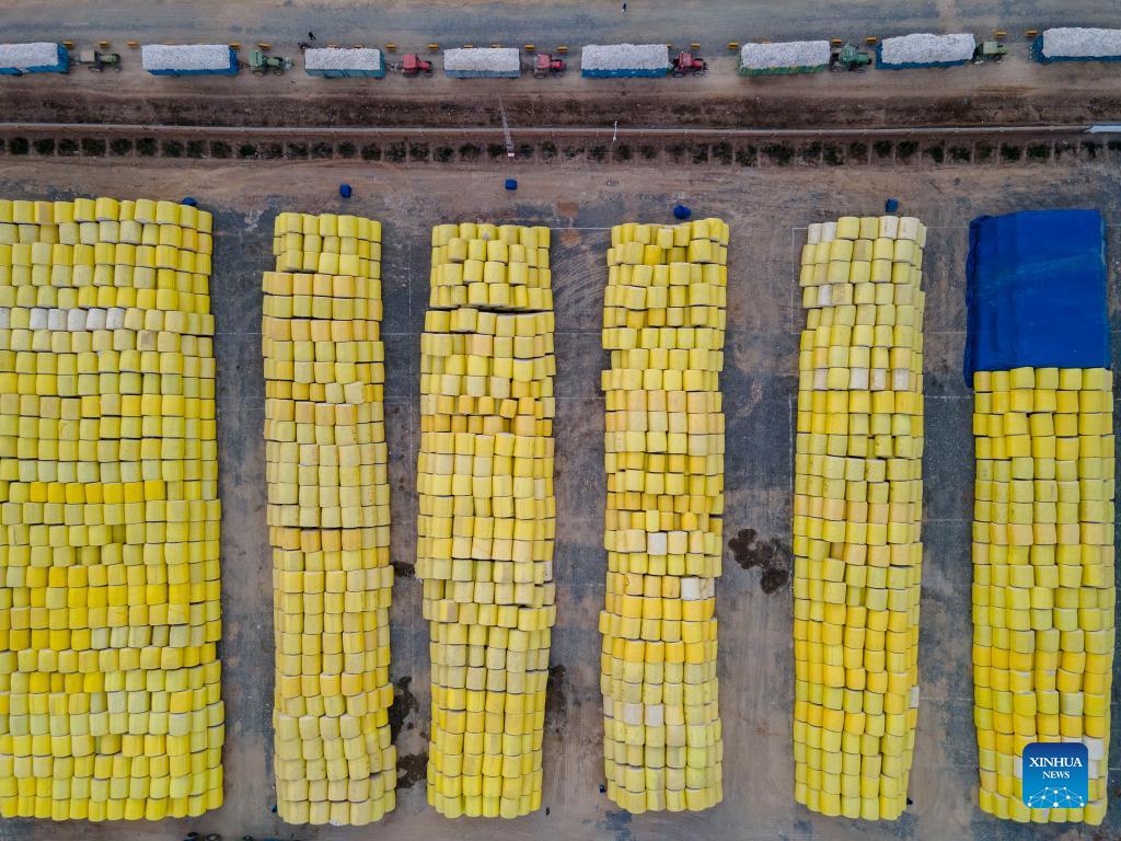 Aerial photo shows farmers wait to sell cotton outside a cotton company in Shawan, northwest China's Xinjiang Uygur Autonomous Region, Oct. 20, 2021. The cotton harvest season started in October in Xinjiang. Xinjiang is the largest cotton-growing area in China. The region's cotton output hit 5.16 million tonnes in 2020, accounting for 87.3 percent of the total in the country, said the National Bureau of Statistics. (Xinhua/Hu Huhu)