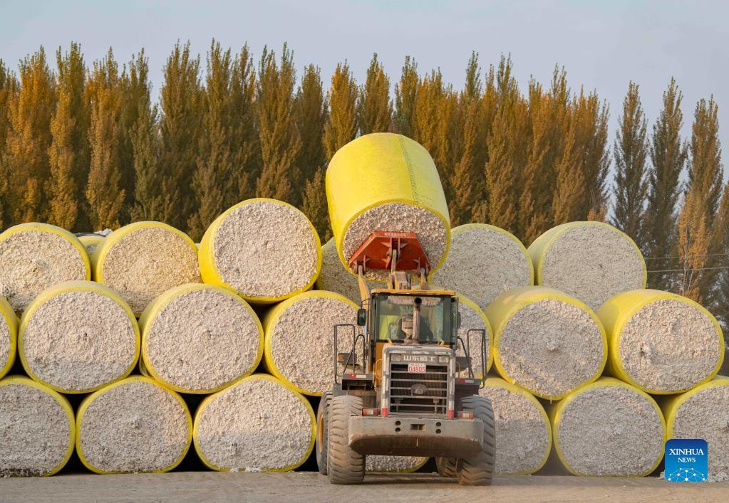 Workers arrange newly-arrived cotton at a cotton company in Shawan, northwest China's Xinjiang Uygur Autonomous Region, Oct. 20, 2021. The cotton harvest season started in October in Xinjiang. Xinjiang is the largest cotton-growing area in China. The region's cotton output hit 5.16 million tonnes in 2020, accounting for 87.3 percent of the total in the country, said the National Bureau of Statistics. (Xinhua/Hu Huhu)