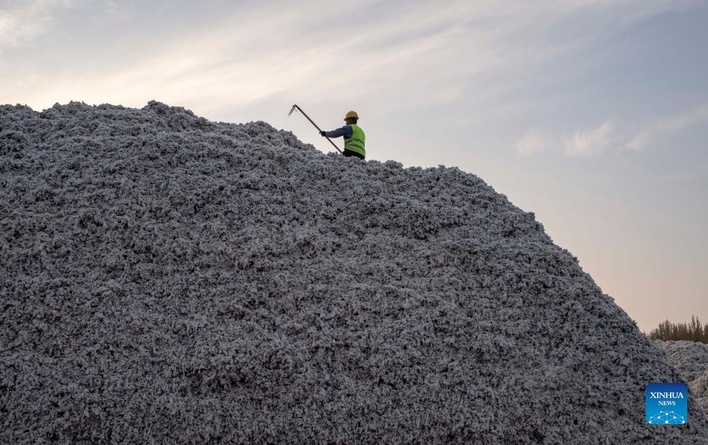 A worker arranges newly-arrived cotton at a cotton company in Shawan, northwest China's Xinjiang Uygur Autonomous Region, Oct. 20, 2021. The cotton harvest season started in October in Xinjiang. Xinjiang is the largest cotton-growing area in China. The region's cotton output hit 5.16 million tonnes in 2020, accounting for 87.3 percent of the total in the country, said the National Bureau of Statistics. (Xinhua/Hu Huhu)