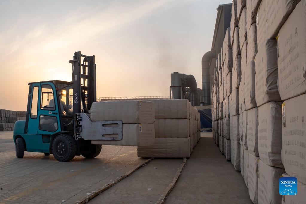 Workers transport processed cotton at a cotton cotton company in Shawan, northwest China's Xinjiang Uygur Autonomous Region, Oct. 20, 2021. The cotton harvest season started in October in Xinjiang. Xinjiang is the largest cotton-growing area in China. The region's cotton output hit 5.16 million tonnes in 2020, accounting for 87.3 percent of the total in the country, said the National Bureau of Statistics. (Xinhua/Hu Huhu)