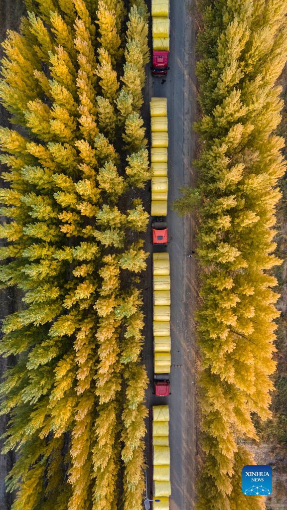 Aerial photo shows trucks loaded with cotton waiting to enter a cotton company in Shawan, northwest China's Xinjiang Uygur Autonomous Region, Oct. 20, 2021. The cotton harvest season started in October in Xinjiang. Xinjiang is the largest cotton-growing area in China. The region's cotton output hit 5.16 million tonnes in 2020, accounting for 87.3 percent of the total in the country, said the National Bureau of Statistics. (Xinhua/Hu Huhu)