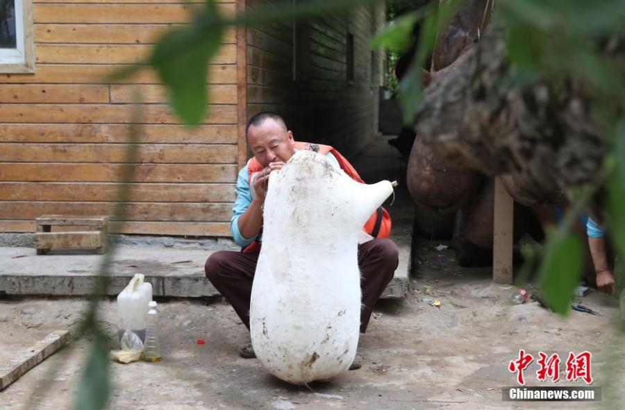 A craftsman makes a goatskin raft. (Photo: China News Service/ Yu Jing, Ji Xiang)