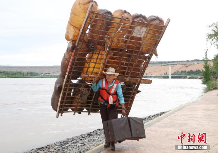 Photo shows a goatskin raft. With a dozen bulging bags made from goatskin fixed on a wooden raft, the raft has been used in Ningxia Hui Autonomous Region since old times. (Photo: China News Service/ Yu Jing, Ji Xiang)