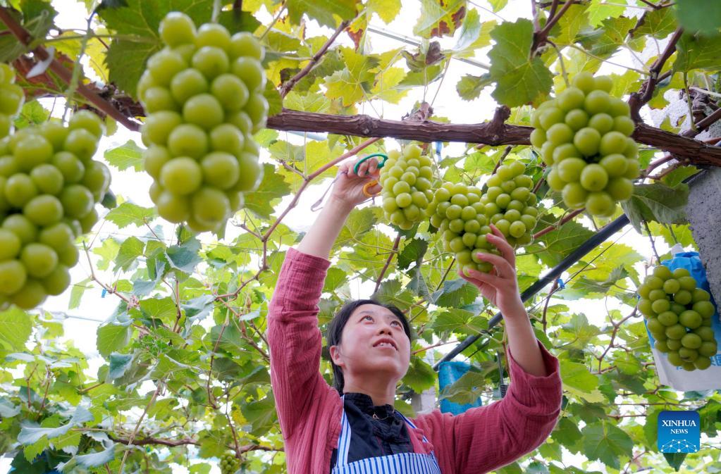 A staff member picks grapes in Nanmazhuang Village of Xinhe County in north China's Hebei Province, Sept. 23, 2021. Xinhe County boosts rural vitalization by developing distinctive agricultural products, improving living environment and elevating governance capability. (Xinhua/Wang Xiao)