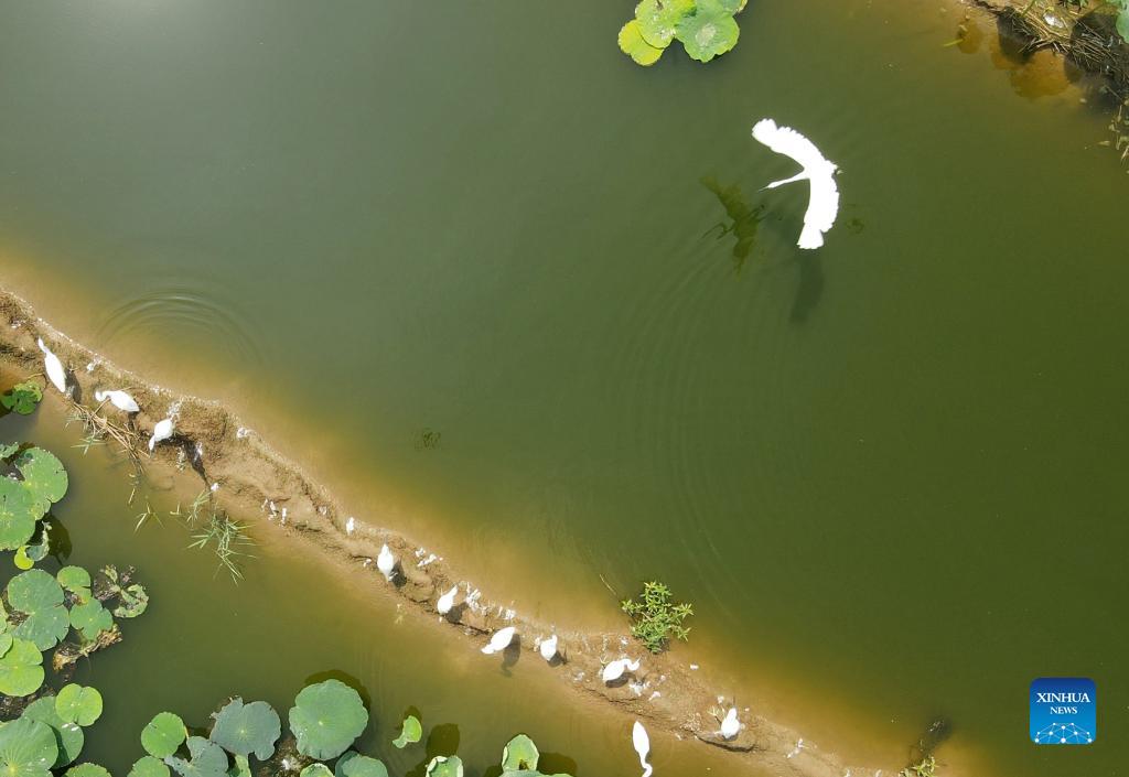 Aerial photo taken on Aug. 3, 2021 shows egrets at Baixuekou Village of Xinhe County in north China's Hebei Province. Xinhe County boosts rural vitalization by developing distinctive agricultural products, improving living environment and elevating governance capability. (Xinhua)