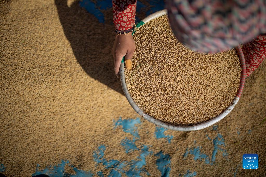 A farmer works at a paddy field in Lalitpur, Nepal on Oct. 22, 2021. Nepali farmers are busy harvesting rice as unseasonal rainfalls in recent days have damaged crops and properties in some parts of the country. (Xinhua/Sulav Shrestha)