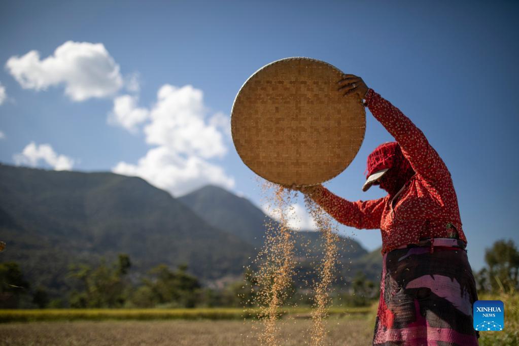 A farmer works at a paddy field in Lalitpur, Nepal on Oct. 22, 2021. Nepali farmers are busy harvesting rice as unseasonal rainfalls in recent days have damaged crops and properties in some parts of the country. (Xinhua/Sulav Shrestha)