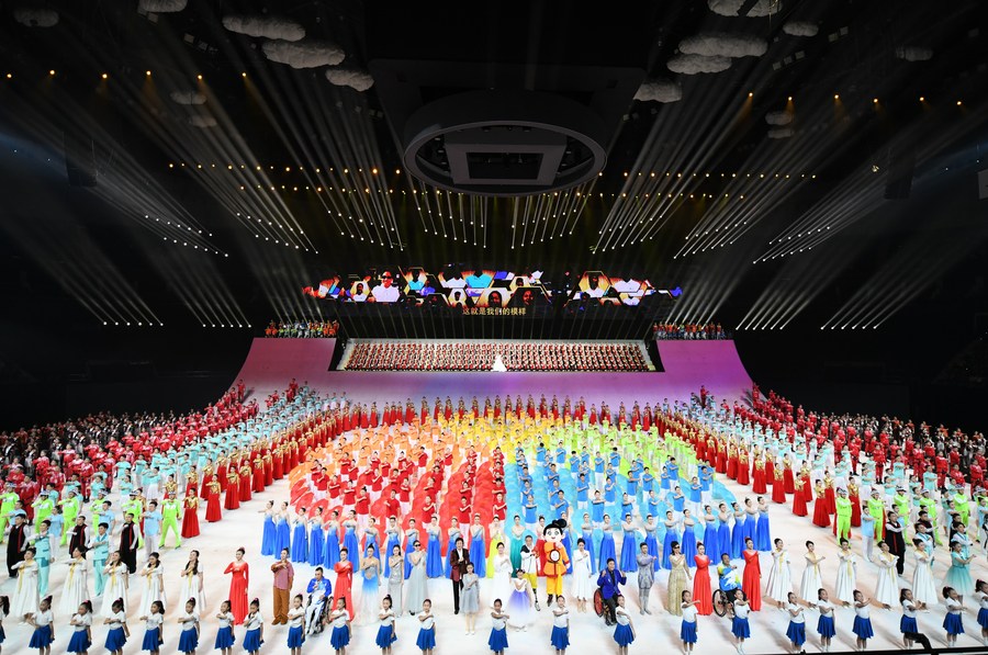 Artists perform during the opening ceremony of the 11th National Games for Persons with Disabilities and the 8th National Special Olympics in Xi'an, Shaanxi Province, Oct. 22, 2021. (Xinhua/Li Yibo)