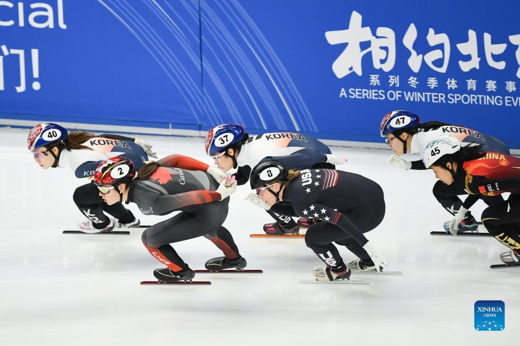 Courtney Sarault (2nd L) of Canada and Kristen Santos (4th L) of the United States compete during the women's 1500m final at ISU World Cup Short Track 2021/2022 in Beijing, capital of China, on Oct. 23, 2021. (Xinhua/Ju Huanzong)