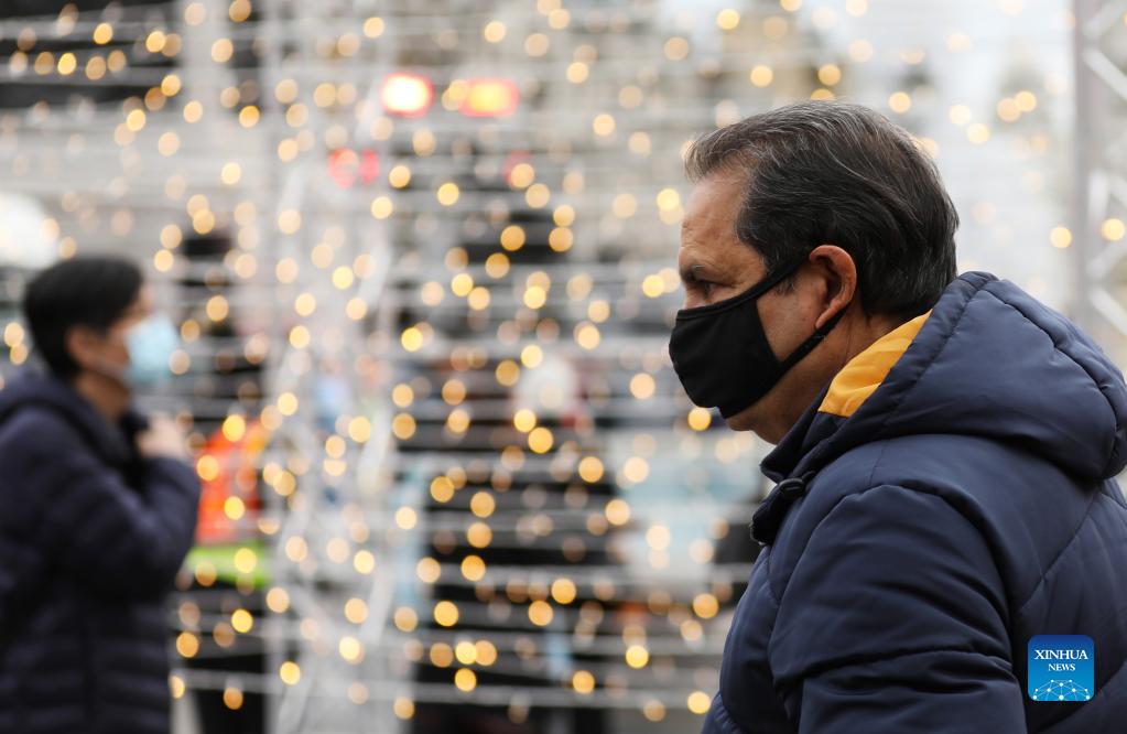 People wearing face masks walk on a street in London, Britain, on Oct. 23, 2021. Another 44,985 people in Britain have tested positive for COVID-19, bringing the total number of coronavirus cases in the country to 8,734,934, according to official figures released Saturday. (Xinhua/Li Ying)