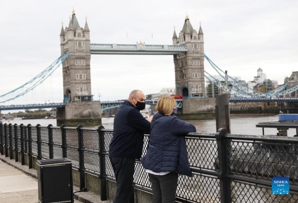 People wearing face masks stand near Tower Bridge in London, Britain, on Oct. 23, 2021. Another 44,985 people in Britain have tested positive for COVID-19, bringing the total number of coronavirus cases in the country to 8,734,934, according to official figures released Saturday. (Xinhua/Li Ying)
