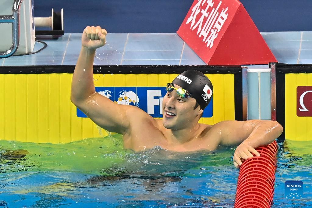 Japan's Seto Daiya reacts after the men's 200m breaststroke final at FINA Swimming World Cup 2021 in Doha, capital of Qatar, Oct. 23, 2021. (Photo by Nikku/Xinhua)