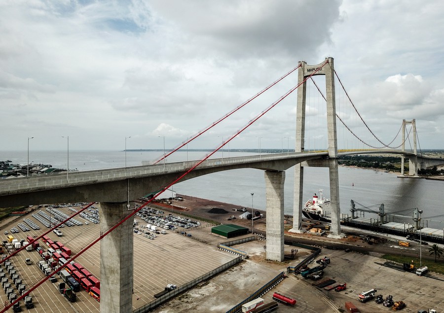 Aerial photo taken on April 8, 2019 shows the Maputo Bay Bridge, built by the China Road and Bridge Corporation with Chinese standards and financial support, in Maputo, Mozambique. (Xinhua/Zhang Yu)