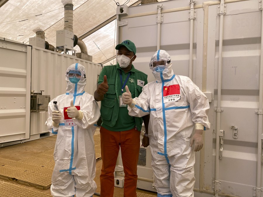 Two Chinese COVID-19 response experts pose for a photo with a local health worker at a nucleic acid testing station in Conakry, Guinea, Sept. 2, 2020. (Xinhua)
