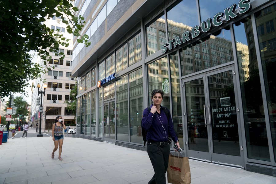 People walk past a Starbucks coffee shop in Washington, D.C., the United States, July 13, 2021. (Xinhua/Liu Jie)