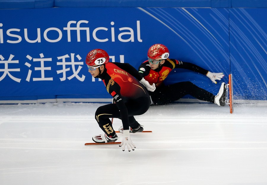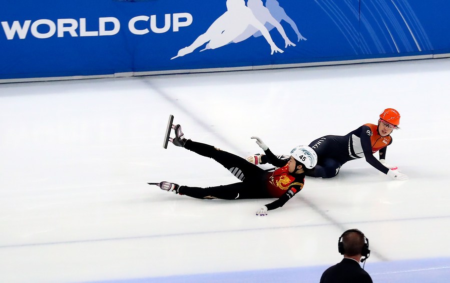 Wu Dajing (back) of China went down during the men's 5,000m relay. (Xinhua/Cao Can)
