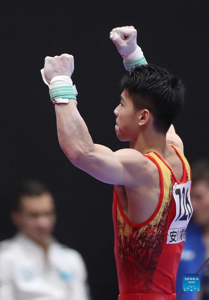 Hu Xuwei of China celebrates after winning the men's horizontal bar final at the 50th FIG Artistic Gymnastics World Championships in Kitakyushu, Japan, Oct. 24, 2021. (Xinhua/Du Xiaoyi)