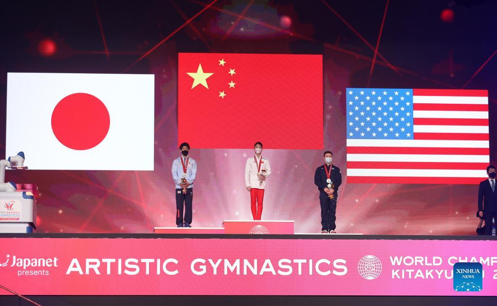 Hu Xuwei (C) of China, Hashimoto Daiki (L) of Japan and Brody Malone of the United States attend the awarding ceremony of the men's horizontal bar final at the 50th FIG Artistic Gymnastics World Championships in Kitakyushu, Japan, Oct. 24, 2021. (Xinhua/Du Xiaoyi)
