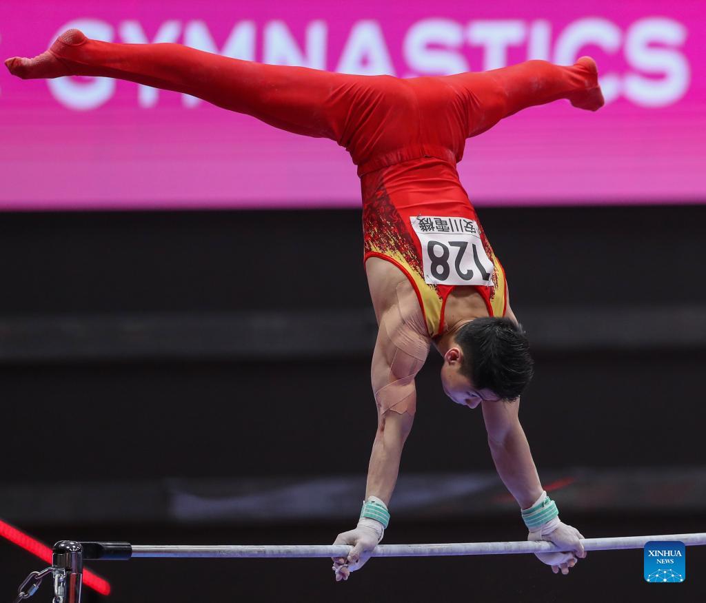 Hu Xuwei of China competes during the men's horizontal bar final at the 50th FIG Artistic Gymnastics World Championships in Kitakyushu, Japan, Oct. 24, 2021. (Xinhua/Du Xiaoyi)