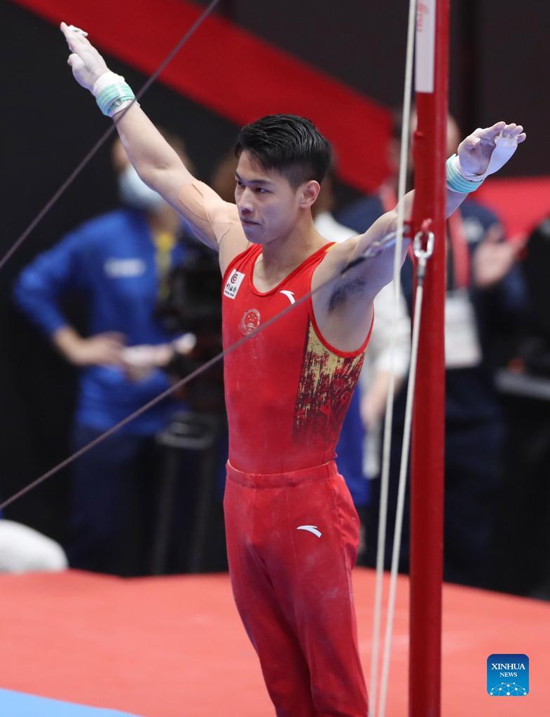 Hu Xuwei of China competes during the men's horizontal bar final at the 50th FIG Artistic Gymnastics World Championships in Kitakyushu, Japan, Oct. 24, 2021. (Xinhua/Du Xiaoyi)
