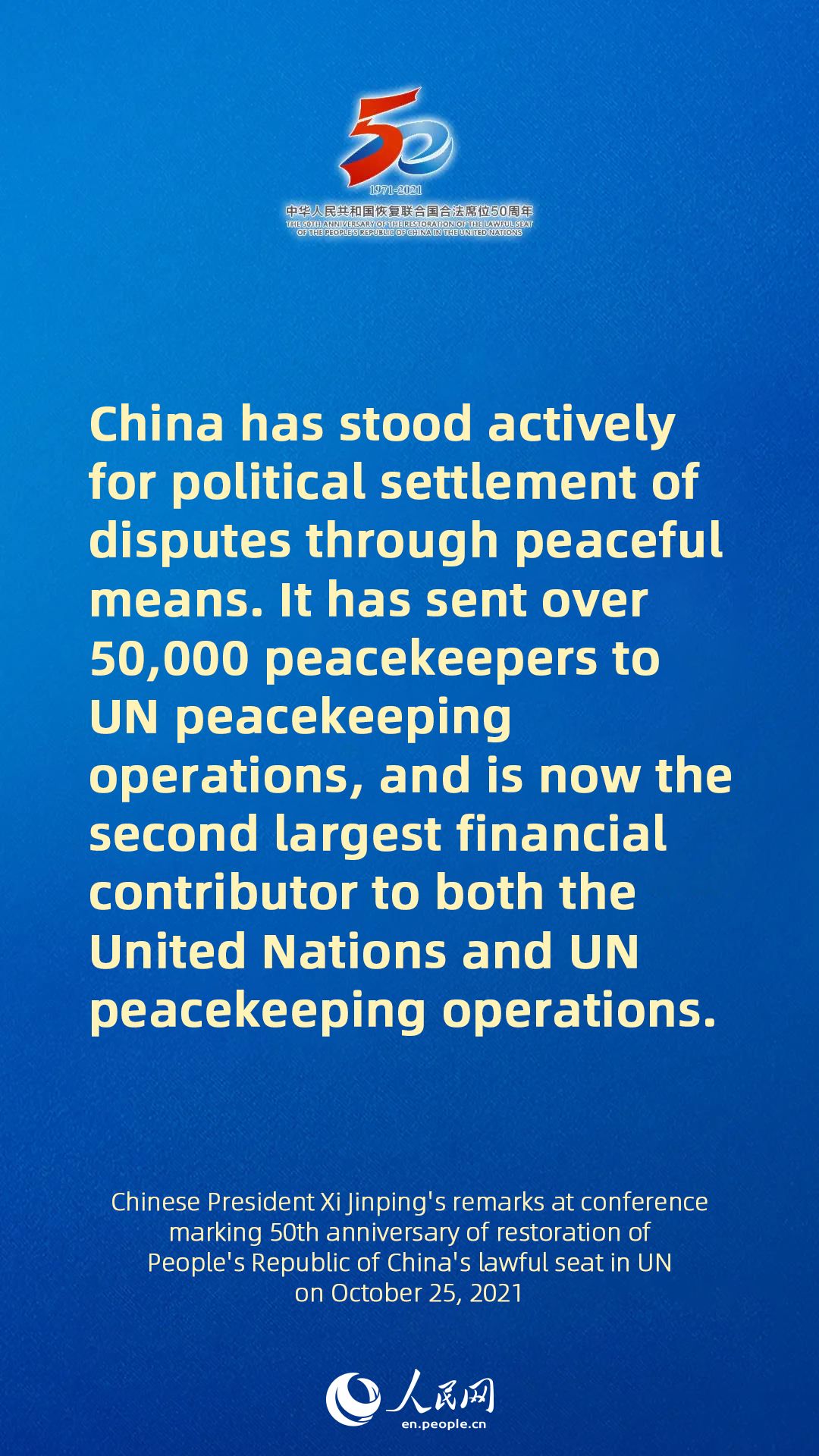 - Full text of Chinese President Xi Jinping's remarks at conference marking 50th anniversary of restoration of People's Republic of China's lawful seat in UN