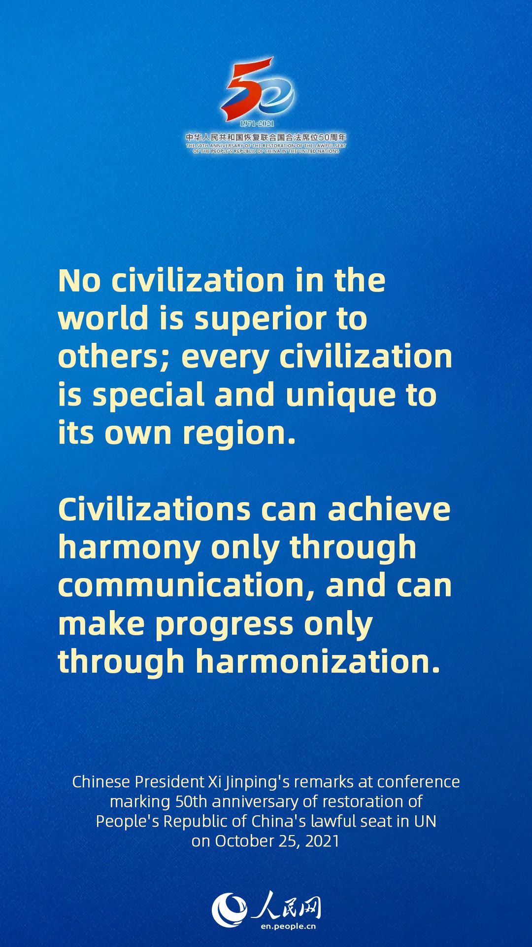 - Full text of Chinese President Xi Jinping's remarks at conference marking 50th anniversary of restoration of People's Republic of China's lawful seat in UN