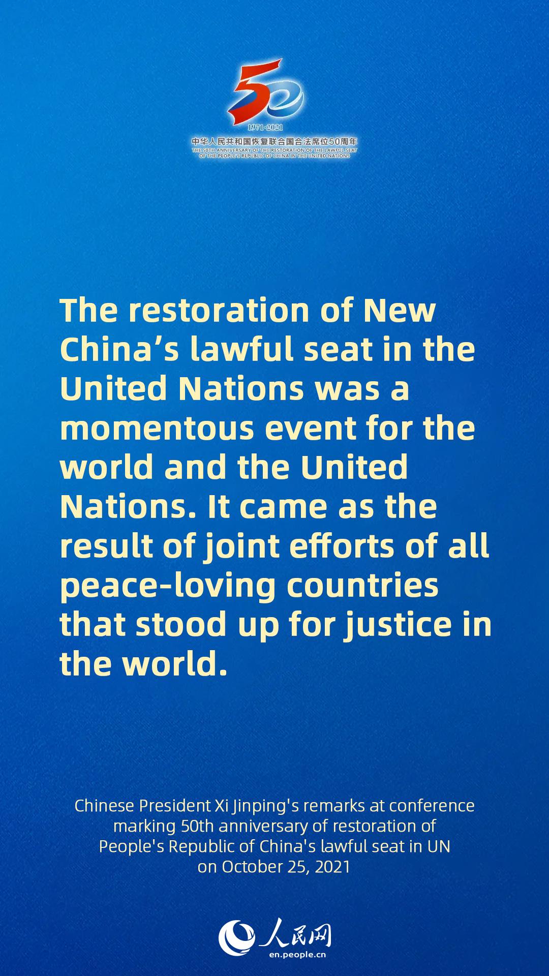 - Full text of Chinese President Xi Jinping's remarks at conference marking 50th anniversary of restoration of People's Republic of China's lawful seat in UN