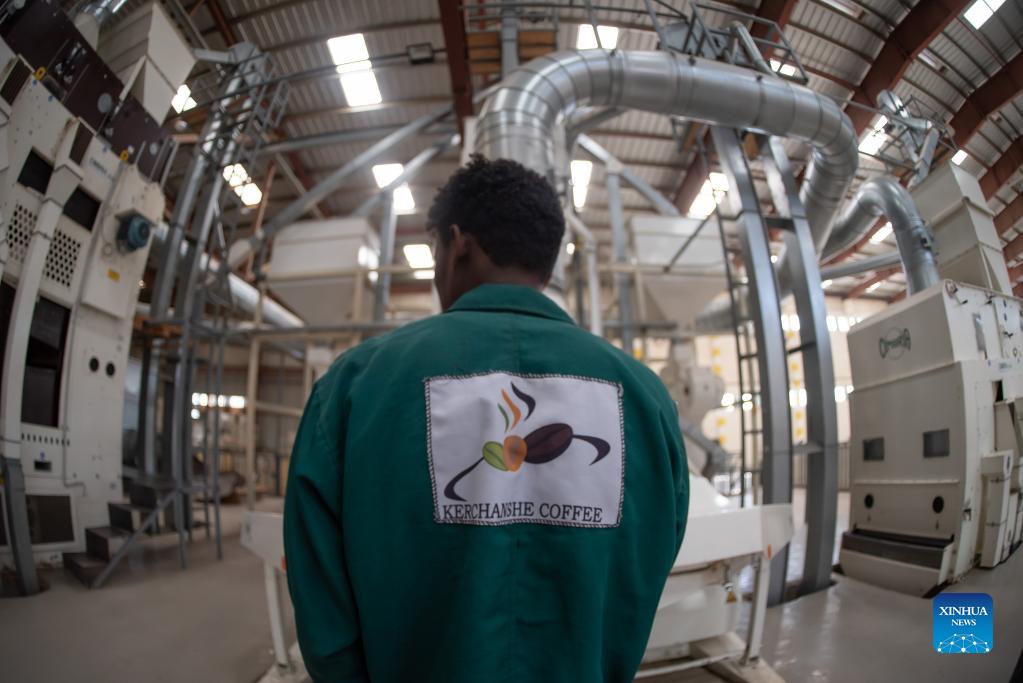 An employee of Kerchanshe Trading Private Limited Company (PLC) operates a machine at a coffee processing plant in Addis Ababa, Ethiopia, on Oct. 21, 2021. Kerchanshe Trading Private Limited Company (PLC), the largest producer and exporter of coffee in Ethiopia, says the upcoming 4th China International Import Expo (CIIE) will create a huge opportunity for coffee-producing and exporting companies. (Xinhua/Michael Tewelde)