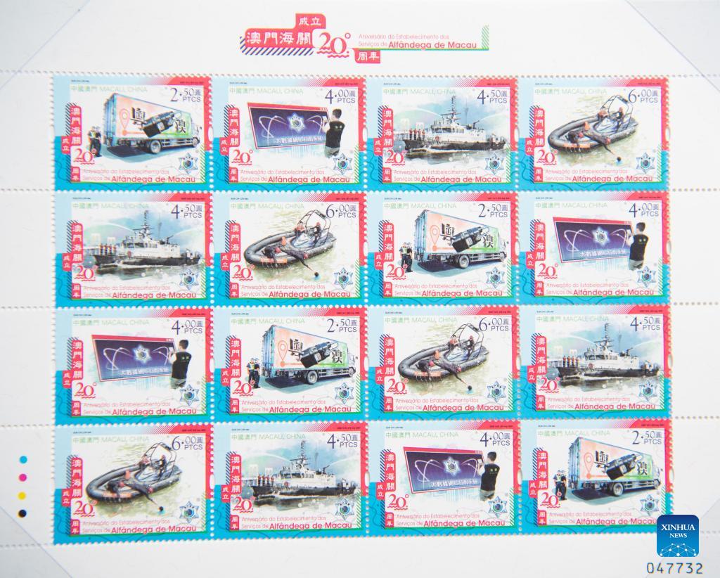 Photo taken on Oct. 25, 2021 shows the special stamps to mark the 20th anniversary of Macao Customs Service, in south China's Macao. The Macao Post would issue souvenir stamps to mark the 150th anniversary of the Kiang Wu Hospital Charitable Association on Oct. 28, the 20th anniversary of the Unitary Police Service on Oct. 29 and the 20th anniversary of Macao Customs Service on Nov. 1. (Xinhua/Cheong Kam Ka)