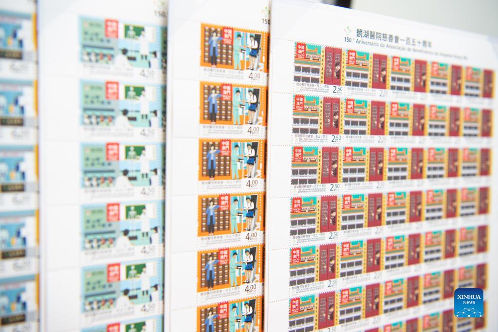 Photo taken on Oct. 25, 2021 shows the special stamps to mark the 150th anniversary of the Kiang Wu Hospital Charitable Association, in south China's Macao. The Macao Post would issue souvenir stamps to mark the 150th anniversary of the Kiang Wu Hospital Charitable Association on Oct. 28, the 20th anniversary of the Unitary Police Service on Oct. 29 and the 20th anniversary of Macao Customs Service on Nov. 1. (Xinhua/Cheong Kam Ka)
