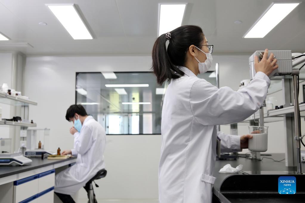 Staff members operate at a laboratory of essential oil brand doTERRA in east China's Shanghai, April 28, 2020. The U.S. essential oil brand doTERRA, a three time participant in the China International Import Expo (CIIE) since 2018, is growing rapidly in China market after its appearance in the CIIE as its launch pad. Boasting a workforce of more than 200 employees, doTERRA is running a factory, a laboratory, and a flagship shop in Shanghai, and its products have attracted a good number of loyal consumers across the country. (Xinhua)