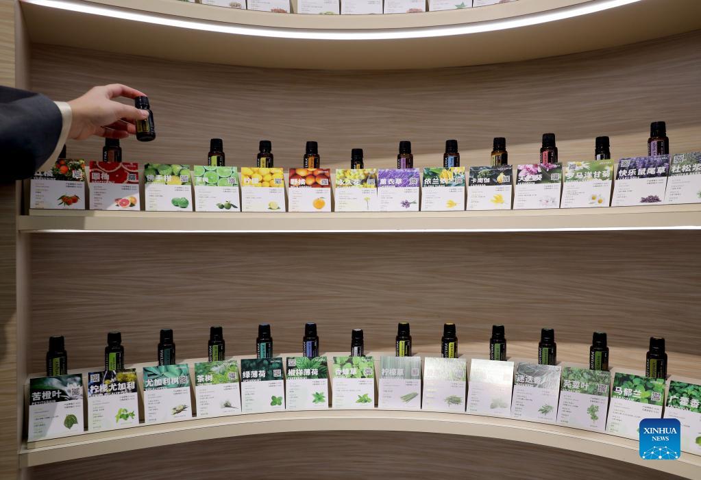 A consumer selects products at the flagship shop of essential oil brand doTERRA in east China's Shanghai, Oct. 22, 2021. The U.S. essential oil brand doTERRA, a three time participant in the China International Import Expo (CIIE) since 2018, is growing rapidly in China market after its appearance in the CIIE as its launch pad. Boasting a workforce of more than 200 employees, doTERRA is running a factory, a laboratory, and a flagship shop in Shanghai, and its products have attracted a good number of loyal consumers across the country. (Xinhua/Liu Ying)