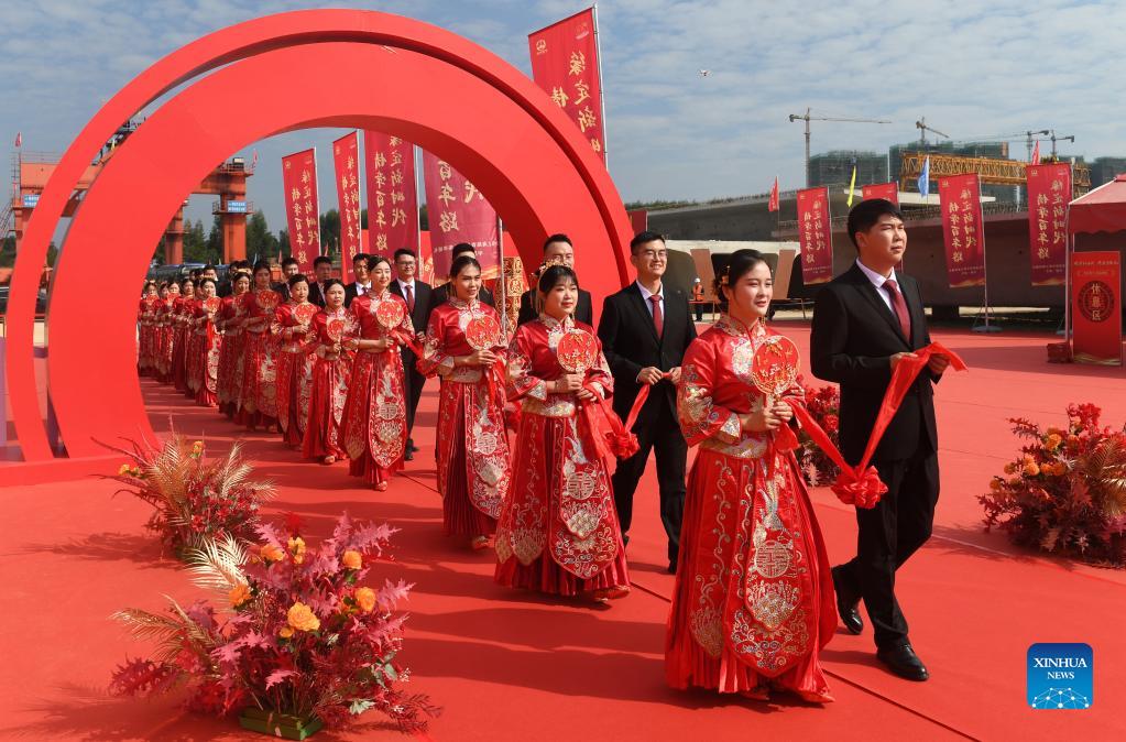 Couples enter the venue of a group wedding at an express railway construction site in Nanning, south China's Guangxi Zhuang Autonomous Region, Oct. 25, 2021. Sixty-four couples, all of them first-line staff members of the China Railway Shanghai Bureau Group Co., Ltd., attended their group wedding in a reformed traditional style here on Monday. (Xinhua/Lu Boan)