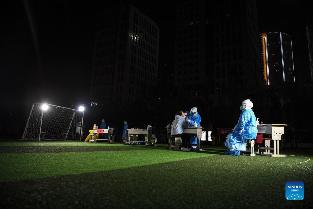 Medical workers take swab samples for nucleic acid testing at a sampling site during the latest COVID-19 outbreak in Yinchuan, northwest China's Ningxia Hui Autonomous Region, Oct. 23, 2021. Thousands of medical workers are on duty around the clock at more than 500 sampling sites in key districts of Yinchuan to conduct the test. (Xinhua/Feng Kaihua)