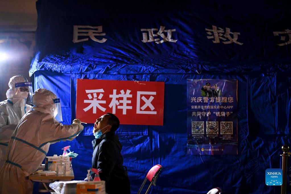Medical workers take swab samples for nucleic acid testing at a sampling site during the latest COVID-19 outbreak in Yinchuan, northwest China's Ningxia Hui Autonomous Region, Oct. 23, 2021. Thousands of medical workers are on duty around the clock at more than 500 sampling sites in key districts of Yinchuan to conduct the test. (Xinhua/Feng Kaihua)