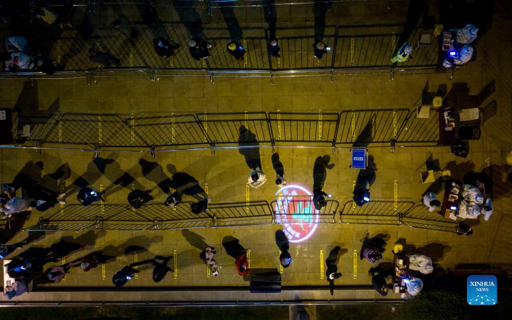Aerial photo taken on Oct. 23, 2021 shows people waiting in line for nucleic acid testing at a sampling site during the latest COVID-19 outbreak in Yinchuan, northwest China's Ningxia Hui Autonomous Region. Thousands of medical workers are on duty around the clock at more than 500 sampling sites in key districts of Yinchuan to conduct the test. (Xinhua/Feng Kaihua)