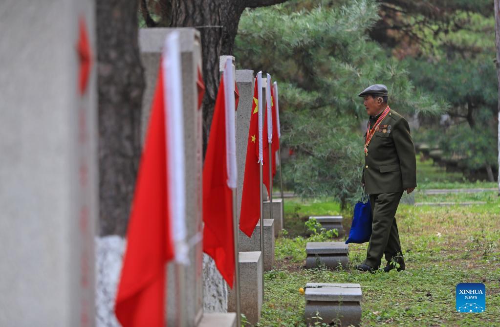 A veteran walks at the Chinese People's Volunteers (CPV) martyrs' cemetery in a commemoration ceremony in Shenyang, northeast China's Liaoning Province, Oct. 25, 2021. A commemoration ceremony was held on Monday in memory of the 71th anniversary of the Chinese People's Volunteers (CPV) army entering the Democratic People's Republic of Korea (DPRK) in the War to Resist U.S. Aggression and Aid Korea. Representatives of CPV veterans and family members of CPV martyrs attended the ceremony. (Xinhua/Yang Qing)