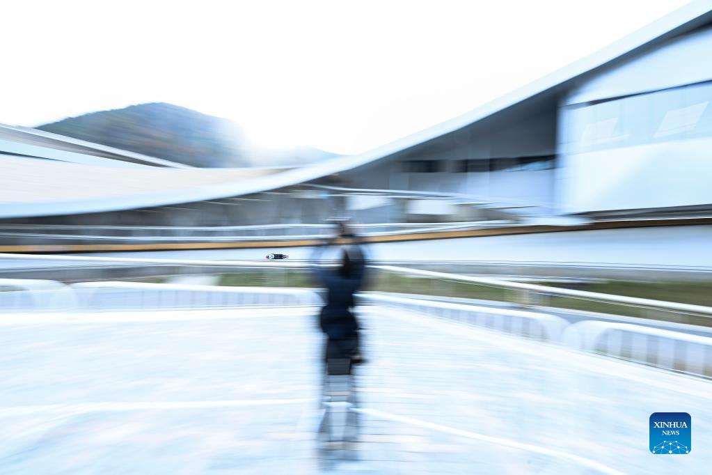 An athlete competes during a men's skeleton test event for the Beijing 2022 Olympic Winter Games at the National Sliding Center in Yanqing Zone, Beijing, capital of China, Oct. 25, 2021. (Xinhua/He Changshan)