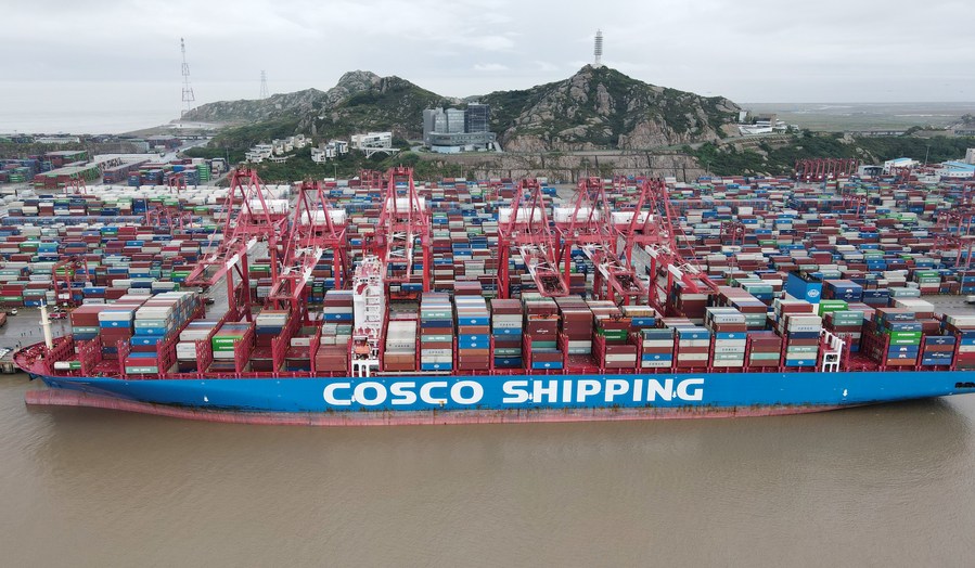 Aerial photo taken on Oct. 13, 2021 shows the container ship Libra of China's COSCO Shipping at Shanghai Yangshan Port, east China. (Xinhua/Fang Zhe)