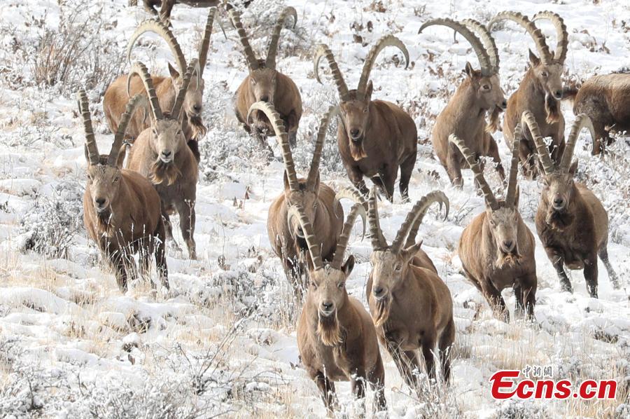 Flocks of Siberian ibex play in the snow in Bozhou, northwest China's Xinjiang Uygur Autonomous Region, Oct. 23, 2021. (Photo: China News Service/Shen Zhijun)