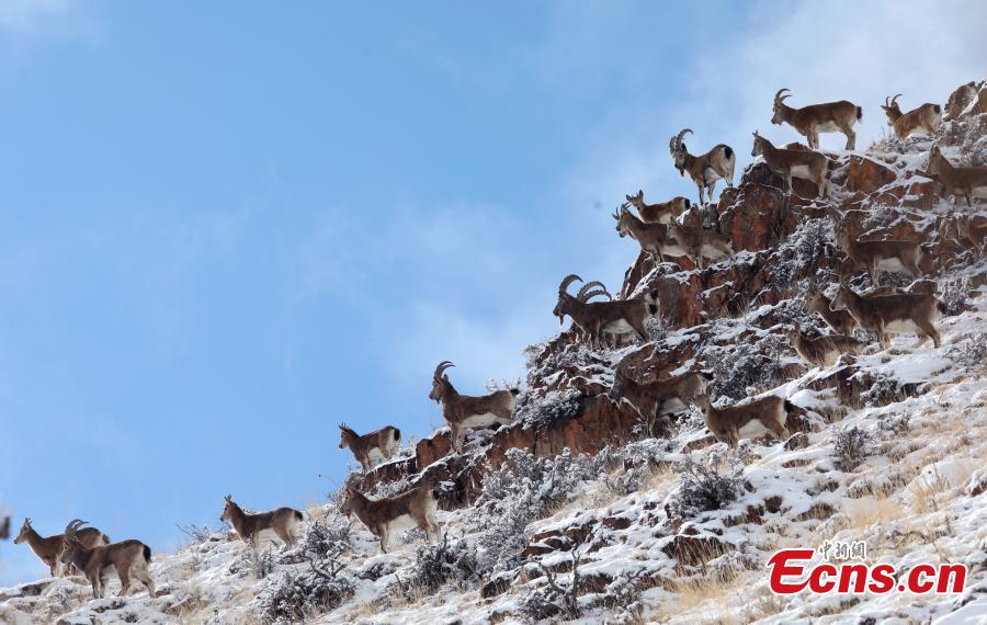 Flocks of Siberian ibex play in the snow in Bozhou, northwest China's Xinjiang Uygur Autonomous Region, Oct. 23, 2021. (Photo: China News Service/Shen Zhijun)